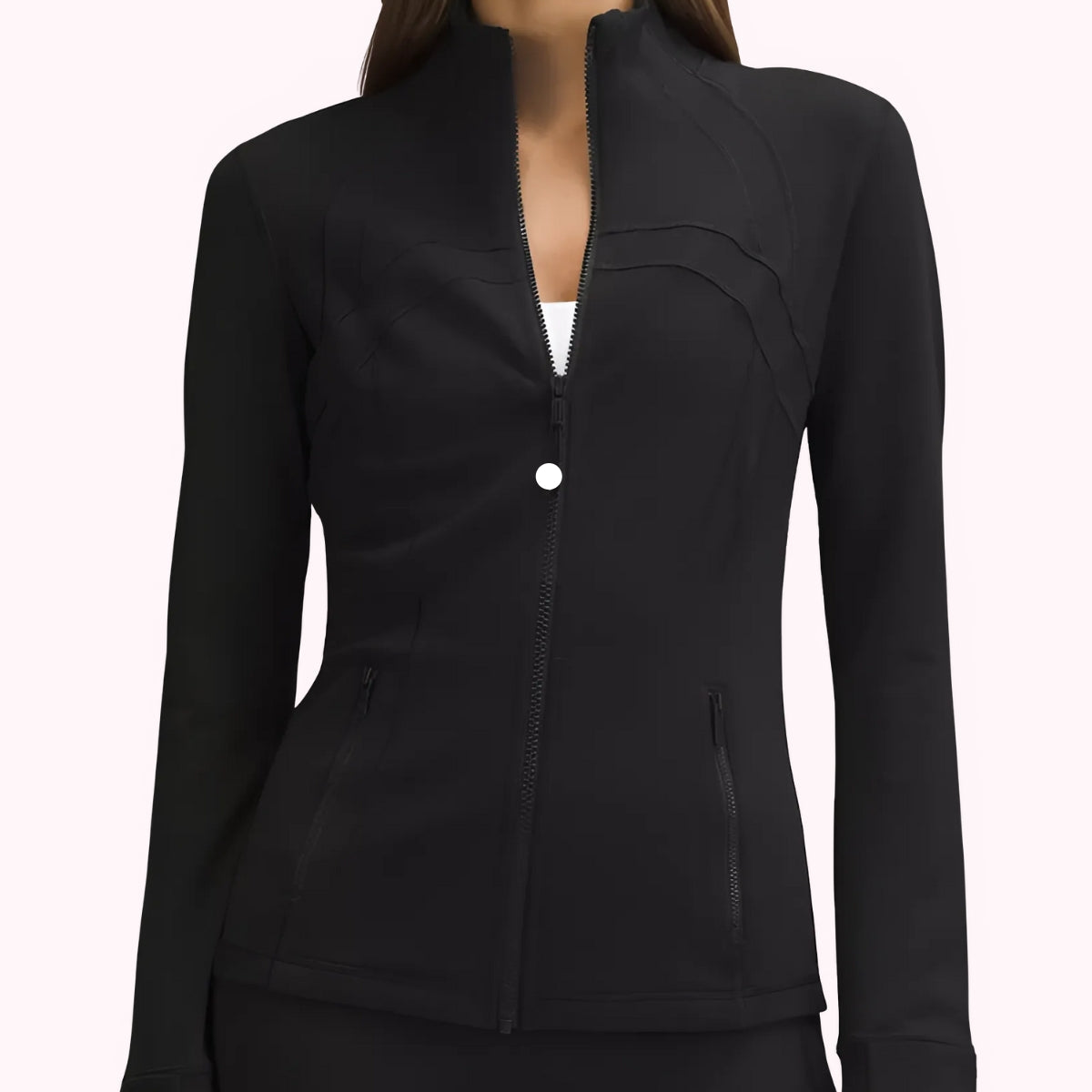 The full-length all Black Define Jacket is designed to flatter your silhouette and move with you. This piece features contour seam detailing, and a smooth, stretchy finish that hugs in all the right places.