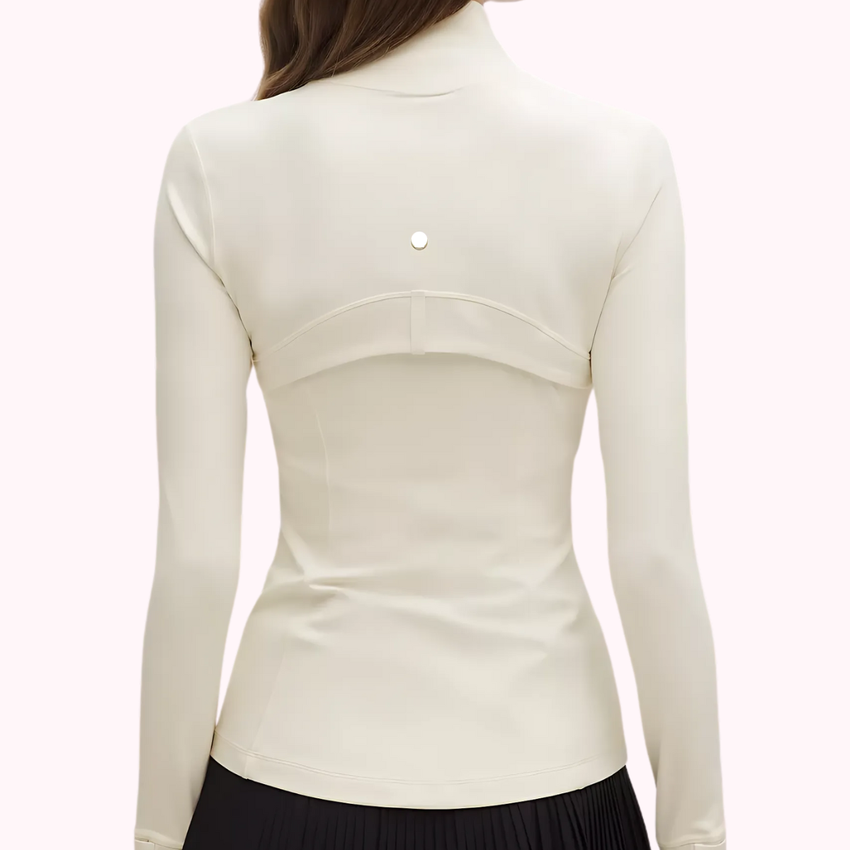 The full length Light Ivory with gold detailing Define Jacket is designed to flatter your silhouette and move with you. This piece features contour seam detailing, and a smooth, stretchy finish that hugs in all the right places.