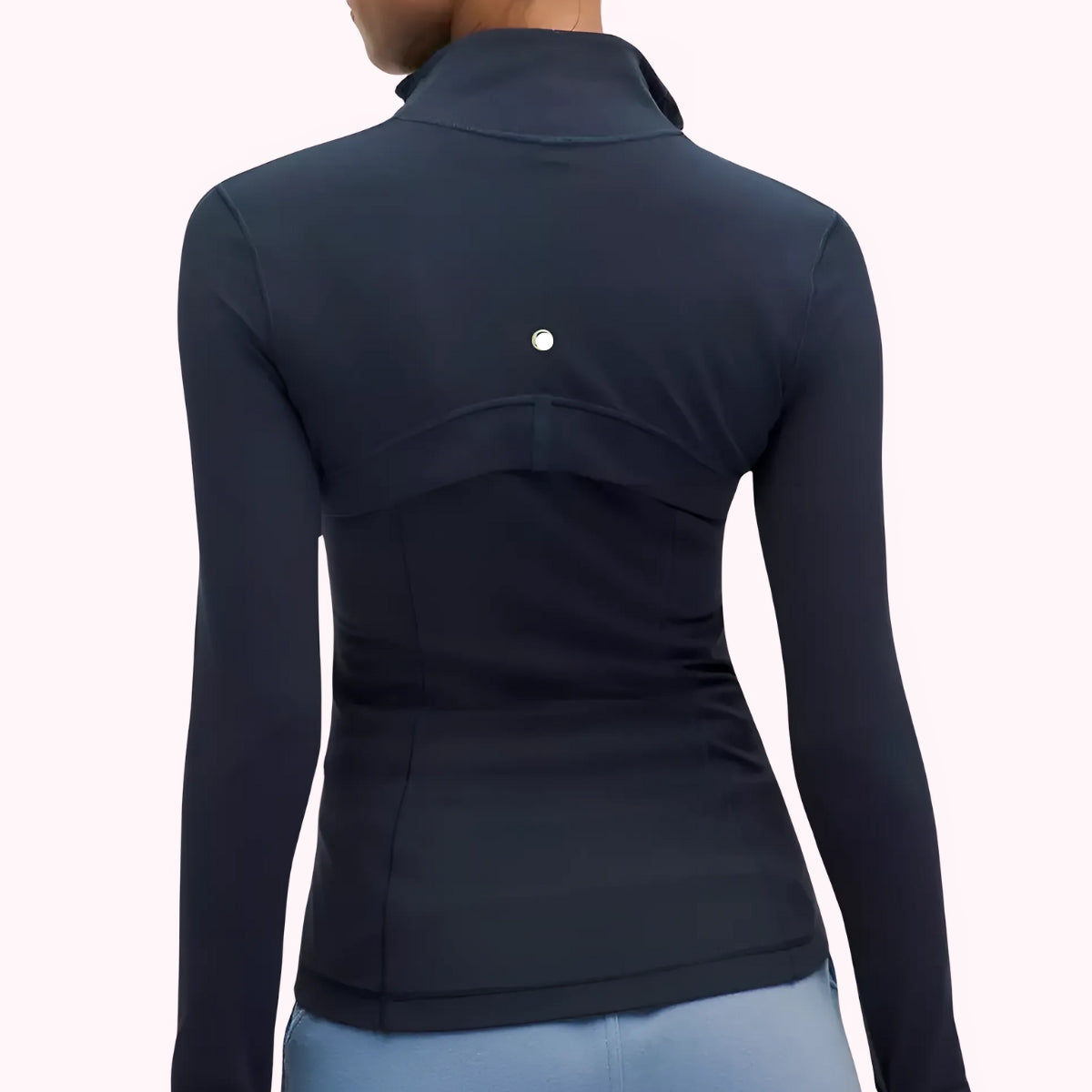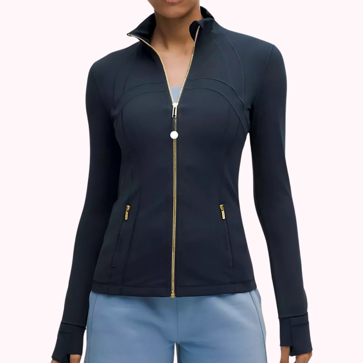 The bestselling full-length Navy Define Jacket is designed to flatter your silhouette and move with you. This piece features a luxe gold zip, contour seam detailing, and a smooth, stretchy finish that hugs in all the right places.